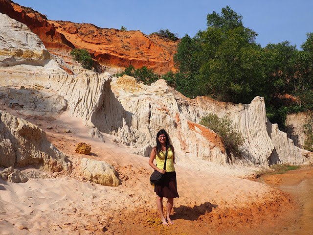 Luego volvimos al hotel a ducharnos y a comer algo antes del tour de la tarde. Antes de las 14 h nos pasaron a recoger en un jeep que ya iba hasta los topes de otros turistas. La primera parada fue el Arroyo de las Hadas (Fairy Stream), un pequeño riachuelo que atraviesa una zona con fascinantes formaciones rocosas. En un principio habíamos pensado visitarlo por nuestra cuenta, ya que estaba muy cerca de nuestro alojamiento, pero casualmente estaba incluido en el tour. Nos dieron 40 minutos para visitarlo a nuestro aire. Este sitio es muy popular en Mui Ne, y se puede recorrer por entero caminando sin calzado por sus aguas, ya que es muy poco caudaloso y su fondo es arenoso. La verdad es que vale mucho la pena: el arroyo pronto atraviesa una zona con un gran talud de una tierra blanca y roja muy bonita (es la misma arena que después origina las famosas dunas que veremos después). El contraste entre el rojo, el blanco y el verde de la vegetación del río nos pareció precioso. La parte por la que se puede caminar del río no es muy larga, y tras unos 20 minutos llegamos a una pequeña catarata a partir de la cual no se puede caminar más. Para volver al punto de inicio había que desandar el camino.